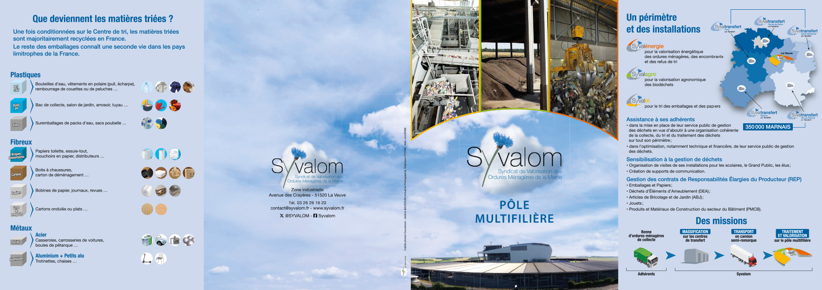 Enfin, nous avons réalisé la plaquette «Pôle multifilière» du SYVALOM qui offre une vue d’ensemble de l’organisation, des missions et des capacités de traitement des déchets ménagers et assimilés sur le territoire géré par le syndicat. Elle présente les trois unités de valorisation — tri, compostage/agronomie et valorisation énergétique — regroupées sur un site unique, et met en lumière les atouts, les chiffres clés, et les enjeux pour l’avenir.